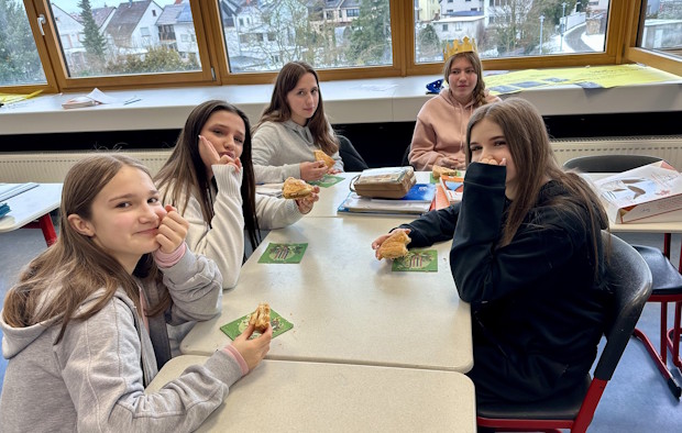 Zunächst erfuhren die Jugendlichen in einem Informationsfilm etwas über die Herkunft und Bedeutung dieser Tradition. Anschließend wurde die Galette in zwei Gruppen gemeinsam verzehrt. In jedem Kuchen war eine kleine Figur versteckt. Wer sie in seinem Kuchenstück entdeckte, war glücklich und wurde zur Königin oder zum König gekrönt.