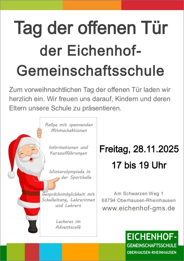 Ankündigungen Tag der offenen Tür Abschlussprüfungen 2026 Neuigkeiten Bonjour Paris! Einschulungsfeier der 5. Klassen Félicitations! Mit der kleinen Qualle ins nächste Abenteuer Projektwoche „Wir sind bunt" Abschlussfeier der Klassen 9a sowie 10a und 10b 6K United in der SAP-Arena Mannheim Besuch des Wasserwerks Sprachreise nach Bournemouth Musiktag in der Grundschulförderklasse Bunt statt blau Der Landtag zu Gast an der Eichenhof-GMS Im Eissportzentrum Spende an das Kinderhospiz „Sterntaler" Sportereignisse im Januar Kooperationsspiele der 8b Abschlussfahrt der 10. Klassen nach Berlin Centre Culturel Franco-Allemand Die 5b als Weihnachtsengel Vorlesetag Bei der Feuerwehr 8a im Jugendtreff Phönix Schulhausübernachtung SoKo auf dem Bauernhof Waldtag der 6b Mit allen Sinnen den Wald entdecken 8b im Jugendtreff Neue Fünftklässler Einschulung der Schulanfänger Sommerzauber Chorwettbewerb „Sing mit!" Ausflug zum Schwimmbad Schulübernachtung In Straßburg Englandsprachreise 2024 5a und 5b im Kurpfalzpark Die Klasse 4 auf Klassenfahrt Jetzt wird gefeiert: DELF Theaterbesuch der 10. Klassen Erfolgreiches Sportjahr Urkunden für evangelische Religruppe Lerngruppen 7 im Theater Venedigs Karneval Buchpräsentation Deutsch-Französische Jugendbegegnung Tag der offenen Tür Klinikseelsorgerin zu Besuch Eislaufen Die Klasse 6b als Weihnachtsengel Englandsprachreise 2024 Briefe für französische Jugendliche im Elsass Hacker-Attack Willkommen an der Gemeinschaftsschule! Herzlich willkommen! Sommerfest der 5b LESEN, LESEN, LESEN... Schulhausübernachtung Abschlussfeier der Klasse 4 Abschlussfeier der Sekundarstufe Wimba Arbeitseinsätze des Elternbeirats JTFO Fußball Das alte Ägypten erleben Herzlichen Glückwunsch zum DELF-Diplom Abschlussfahrt nach Berlin Abschlussfahrt nach Köln Roboter AG Im Jugendzentrum Phönix Aus der Schulsozialarbeit „Die Linde erzählt ihre Geschichte" Kulinarischer Französischunterricht Doppelter Spaß in Karlsruhe Tag der offenen Adventstüren Tag der Berufsorientierung Weihnachtsaktion 1001 Nacht Sicherheit macht Schule Förderverein Einschulungsfeier der Fünftklässler Endlich geht es los England - wir kommen! Abschlussfeier Zoobesuch Mitmachmusical Coming soon!!! Fructonia Mottowoche Bundeswettbewerb Fremdsprachen „1001 Nacht" Ausflug ins Staatstheater Ausflug zum Biohof Offener Treff SoKo Neue Sitzgelegenheiten Gar nicht erst anfangen Dekomaterial von der Firma Schenk Bundeswettbewerb Fremdsprachen Endlich wieder singen! Schön, dass ihr da seid! Voilà, c´est reparti!.. „Körperwelten" Die neue Bläserklasse kommt! Corona-Galerie Phönix Lernzimmer Weihnachtsaktion der 7b Félicitations! Herzlich willkommen! Abschluss 2020 The Big Challenge Bläserklasse Osterpost Phönix goes digital Französischlerngruppen 9/10 en excursion Berufs- und Studienorientierung Speeddating 10b und 10c im Staatstheater Kooperationsvertrag 10d im Badischen Staatstheater Bei der Feuerwehr Feierliches Adventskonzert Back-Aktion Tag der offenen Tür Englandsprachreise 2019 Sportereignisse 2019 25 Jahre Förderverein Platz 1 für die GMS Oberhausen Frankreichaustausch UFO - Kein Wunsch ist schnuppe Die 8b in Saarbrücken The Big Challenge 2019: Zwei Hauptgewinne Abschlussfahrt an den Gardasee Vorlesewettbewerb Aktion „Gesundes Frühstück" Börsen-AG The Big Challenge